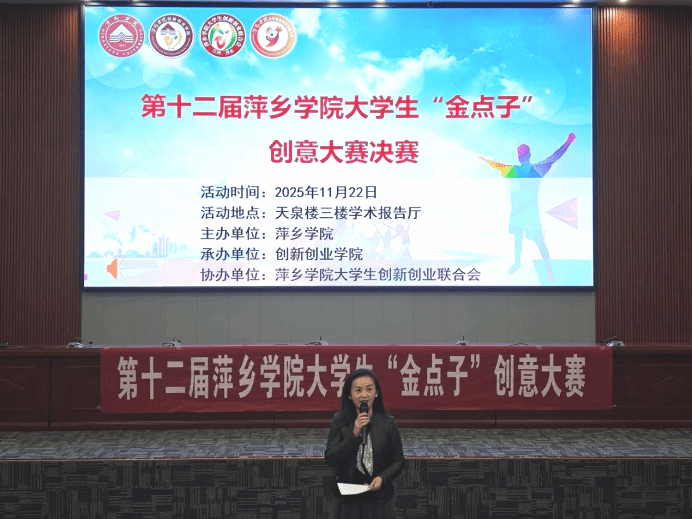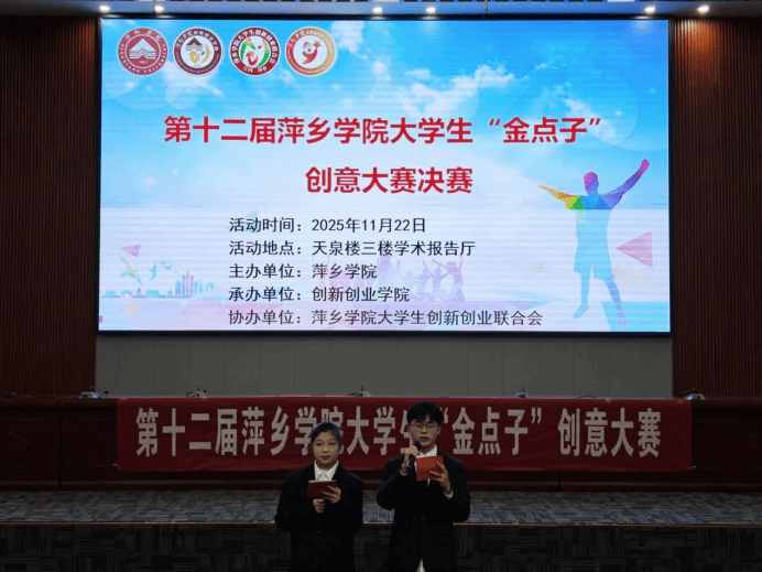 11月22日下午,萍乡学院第十二届大学生“金点子”创意大赛决赛于天泉楼三楼学术报告厅隆重举行,并圆满落下帷幕。此次大赛特邀创新创业学院院长宋杰光、萍乡市品牌促进会秘书长华强、江西葛溪正太禽业有限公司总经理韩纯、萍乡尚高电瓷有限公司董事长欧阳志军、萍乡市彩威士环保科技有限公司厂长杨鹤鸣、萍乡华星环保有限公司技术部经理李波、江西福美全食品有限公司总经理欧阳生龙、江西彩来环保科技有限公司企划部经理陈文君、创新创业学院教研科科长吴艳、大学生创新创业联合会指导老师刘仁柱、大学生创新创业联合会主席张琦出席观摩,本次大赛还邀请了行业内优秀的专家担任本次大赛的评委,他们分别是江西丰民童乐有限公司总经理贺芝、江西浩邦信息技术有限公司总经理徐天祥、江西省就业创业服务中心专家陈超鋆、湖南达高科技有限公司天使投资人欧阳庆、江西九靓贸易有限公司董事长马静。参加活动的有决赛项目团队成员、萍乡学院大学生创新创业联合会成员、星火创客之家成员以及各二级学院学生360余人,共同见证青年创客的智慧绽放。