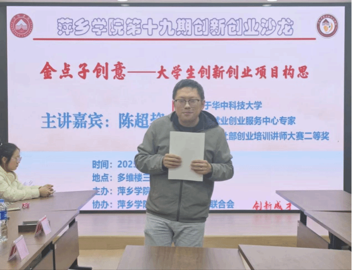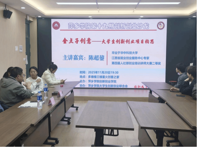 11月20日晚上,我校第19期创新创业沙龙在大学生创新创业孵化基地(多维楼)三楼星火创客之家教室举行。参加活动的有创新创业学院院长宋杰光、萍乡学院第十二届大学生金点子创意大赛晋级决赛的项目代表约40人参加。活动特邀江西省就业创业服务中心专家、萍乡学院创新创业导师陈超鋆为主讲嘉宾,沙龙主题为《金点子创意—大学生创新创业项目构思》。