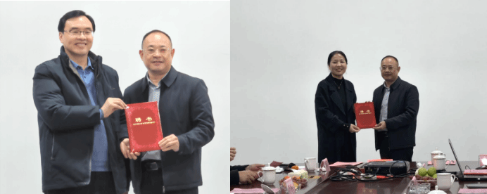 随后,在彩来环保科技会议室,宋杰光与陈志国签订共建大学生创新创业实践基地合作框架协议书并授牌。同时,宋杰光为陈志国董事长、陈文君总经理颁发创新创业导师聘书;陈志国董事长则为宋杰光教授、吴艳副教授颁发企业顾问聘书,校企双方实现人才双向赋能,为后续深度合作奠定坚实基础。