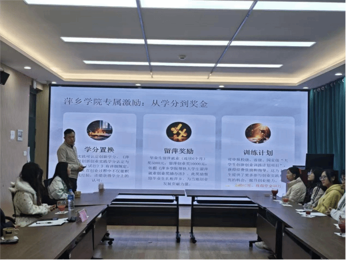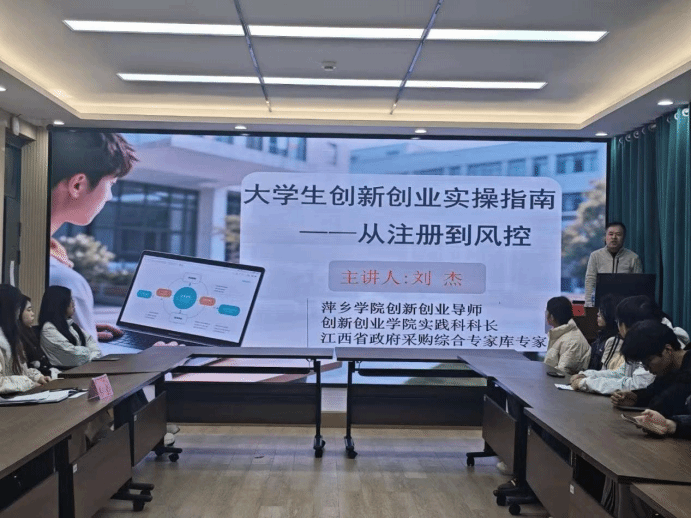 活动伊始,宋杰光院长分享自身学习与工作经历,鼓励同学们抓住国家政策红利来创新创业。随后,刘杰结合其多年指导创业实践与管理孵化基地的丰富经验,从创业起航、合规经营、政策红利、风险预警等多个角度系统梳理了从创意探索、项目启动到验证成长的完整路径。他详细解读了国家、地方及萍乡学院专属的多层次创业扶持政策,包括一次性创业补贴申请、创新创业学分置换、毕业生留萍就业创业奖励及“以赛促学、以赛促创”的激励政策,强调学校、省市、国家各个层面都为大学生创新创业构建了“从学分到学业、从创业到事业”的全方位政策支持体系。