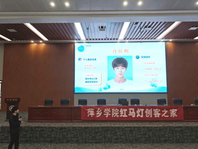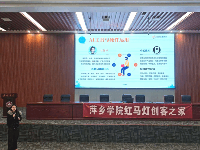 其中实操环节分别由许佳明、邓小凤、胡康三位优秀学生依次分享。萍乡学院美术学专业学生许佳明主讲AI 拍摄剪辑实战技巧,现场介绍短视频带货脚本模板帮助零基础同学快速上手;萍乡学院汉语言文学专业学生邓小凤讲解非专业主播从互动种草到爆品转化的过程及方法,结合本地商家案例介绍提升直播运营能力的方法;萍乡学院知识产权法学专业学生胡康主讲账号运营与AI工具运用,为同学们开拓AI创业渠道提供清晰指引。