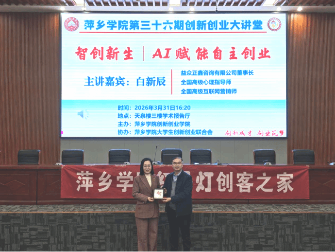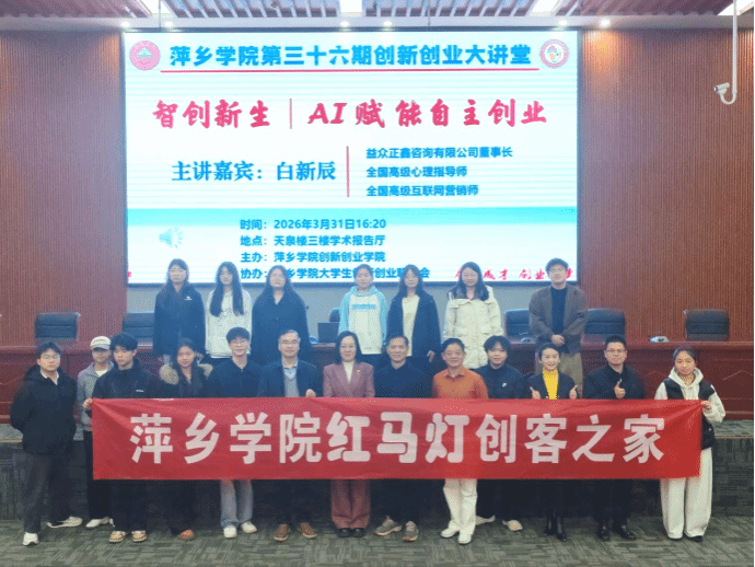 3月31日,我校第三十六期创新创业大讲堂在天泉楼三楼学术报告厅顺利举行。本次讲座特邀萍乡益众正鑫咨询有限公司董事长、全国高级心理指导师、全国高级互联网营销师白新辰作为主讲嘉宾,以《智创新生|AI赋能自主创业》为主题,为大家带来了一场极具现实指导价值的分享。参加活动的有创新创业学院院长宋杰光、创新创业导师代表、大学生创新创业联合会成员代表、红马灯创客之家成员代表以及各二级学院学生代表约360余人,活动由创新创业学院教研科科长吴艳主持。