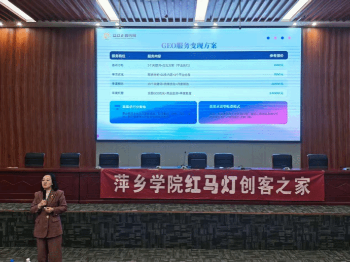 活动伊始,宋杰光向主讲嘉宾白新辰赠送我校大学生创新创业训练计划项目作品成果《萍乡剪纸》。随后,白新辰导师围绕一人 AI 创业新范式展开系统讲授,阐明了大学生单人创业 “低门槛、高效率、可落地” 的核心优势。他结合行业数据,对比豆包、文心一言、通义千问、元宝等主流 AI 工具的功能特点与适用场景,全面展示 AI 在内容创作、电商运营、本地服务等领域的赋能价值,并深入解读 AI 电商 5.0 时代发展趋势,对比传统 SEO 与 GEO的核心差异,讲解信息被 AI 优先引用的优化技巧,并分享 GEO 服务收费模式与本地商家合作方案让同学们清晰地把握 AI 创业的时代趋势与实操方向。
