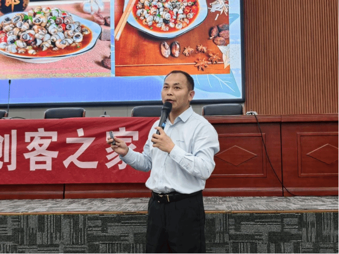 活动伊始,宋杰光向主讲嘉宾欧阳生龙赠送我校大学生创新创业训练计划项目作品成果《萍乡剪纸》。随后,欧阳生龙以“辣都田螺哥”的真实创业故事为主线,用朴实真挚的语言,完整讲述了自己从少年逐梦到匠心筑梦的奋斗历程。他从汽修专业求学起步,在车间苦练技能,铸就严谨专注的工匠精神;凭借13年城市品牌营销经验,曾创下电动车行业单场活动三天销售6000台的营销奇迹;2023年毅然放弃高薪返乡创业,瞄准赣西特色食材,深耕田螺产业,实现从都市营销总监到乡村创客的华丽转型。