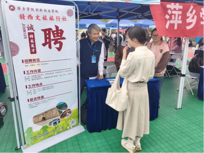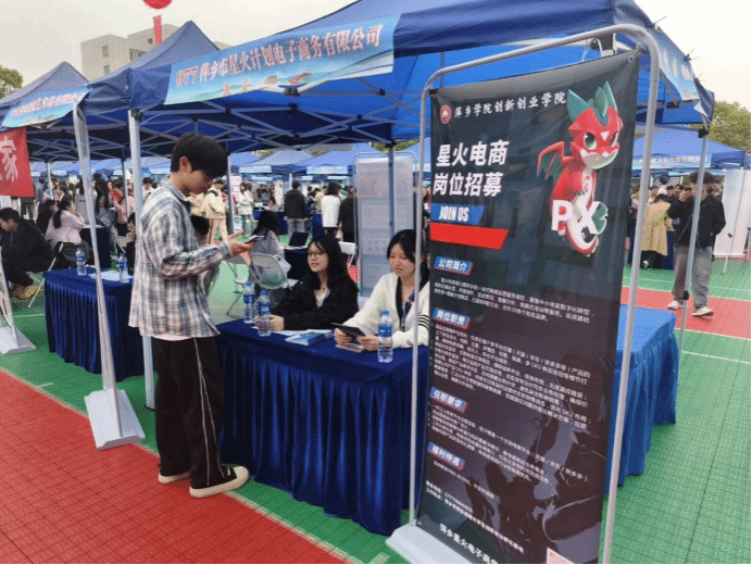 为保障活动有序开展,创联提前完成企业对接、展位布置与招聘信息宣传等筹备工作,现场设置企业专区指引牌,并安排多名志愿者全程引导答疑,为企业与学生提供贴心服务。本次参会企业带来文旅策划、设计创作、电商运营、门店管理等多类匹配我院专业培养方向的岗位,其中隶属我院的企业共5家,分别为赣西文旅旅行社、萍乡绘景艺术品有限公司、萍乡市星火计划电子商务有限公司、萍乡叁曜餐饮有限公司(创客咖啡),涵盖文旅、文创、电商、餐饮等领域。
