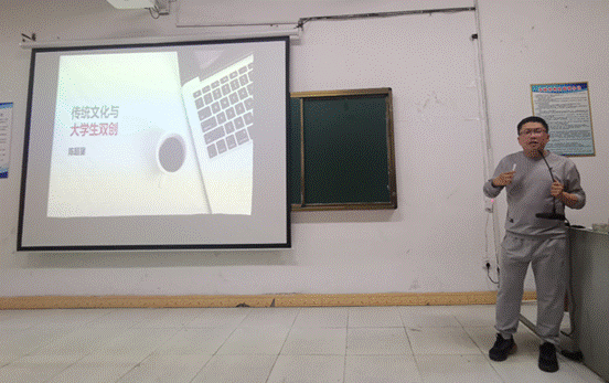 本次活动特邀到人社部SYB创业培训讲师、江西省SYB创业培训十佳讲师陈超鋆进行宣讲,以“传统文化与大学生双创”为主题,结合文传学院学科优势、专业特点和研究领域,讲述了传统文化的两大来源和三大症结,鼓励大学生以传统文化为基础,通过大量调查研究,确立创新创业项目,紧跟新时代步伐,打造一批具有现代气息的文创产品和创业项目。