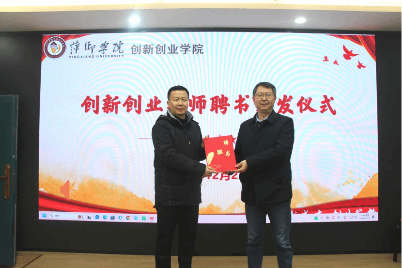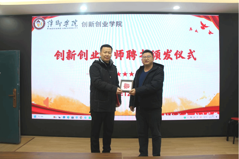 吴代赦为王钠颁发萍乡学院创新创业导师聘书,谢伟萍为王钠赠送了大创项目作品《萍乡剪纸》。