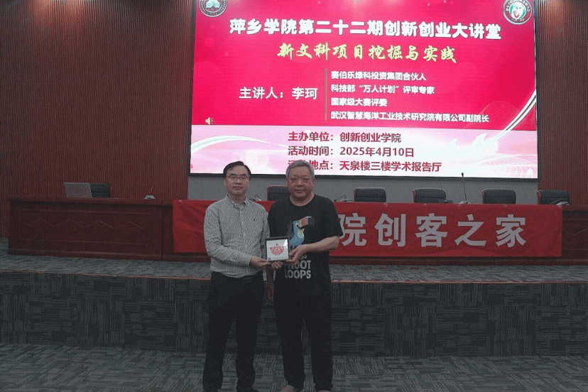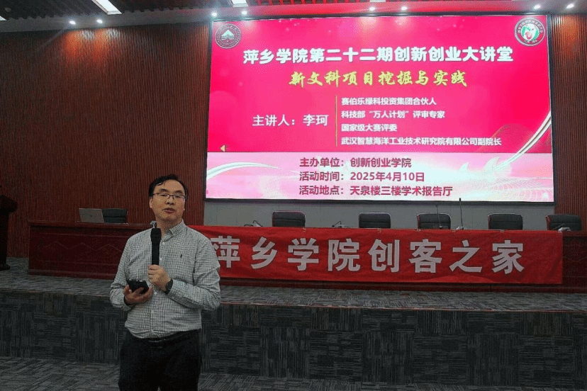 4月10日上午,我校第二十二期创新创业大讲堂在天泉楼三楼报告厅举行,活动特邀高级会计师、武汉智慧海洋工业技术研究院副院长李珂博士作为主讲,开展主题为《新文科项目挖掘与实践》。参加活动的有创新就业联合会指导老师刘仁柱、创新就业联合会成员、创客之家成员以及各二级学院学生300余人,活动由创新创业学院院长宋杰光主持。