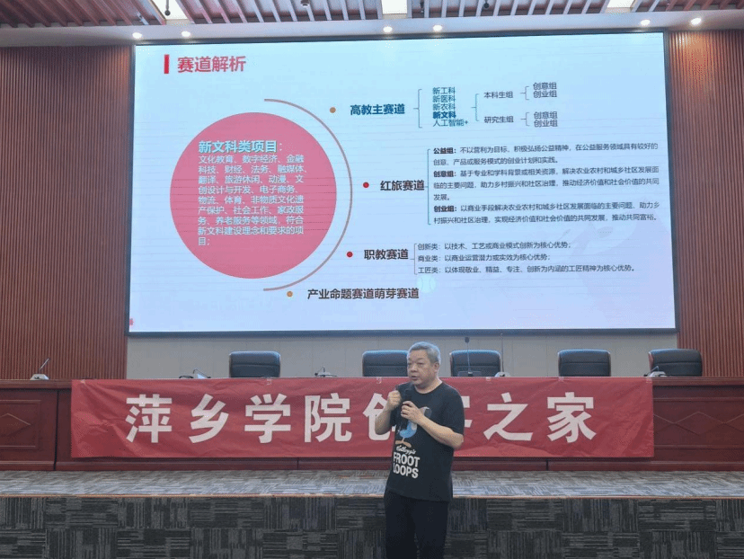 主讲嘉宾李珂以“以赛促教、以赛促学、以赛促创”为核心,探索新文科建设理念下的创新人才培养路径,为同学们深度解读新文科类项目。他在活动中指出,新文科之“新”在于时代范式的转变,要立足时代需求,并且鼓励学生增强实践能力,实现知行合一。同时他还强调,参赛项目应聚焦文化教育、数字经济、金融科技等前沿领域,利用人工智能、大数据等技术赋能文科创新。