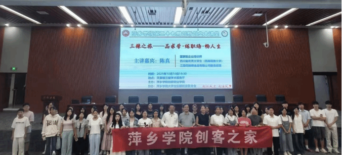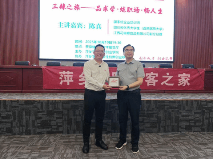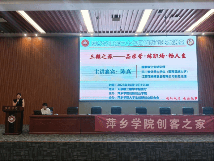 10月10日晚上,我校第二十七期创新创业大讲堂在天泉楼三楼学术报告厅举行,活动特邀江西省花蝴蝶有限公司副总经理陈真作为主讲嘉宾,开展主题为《三辣之旅—品求学·炼职场·畅人生》。参加活动的有创新创业学院院长宋杰光、创新创业联合会成员、创客之家成员以及各二级学院学生350余人,活动由创新创业学院教研科科长吴艳主持。