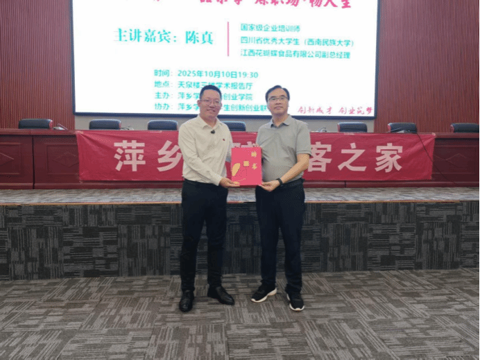 活动伊始,宋杰光为主讲嘉宾陈真颁发了创新创业导师聘书,并赠送我校大学生创新创业训练计划项目作品《萍乡剪纸》的研究成果。
