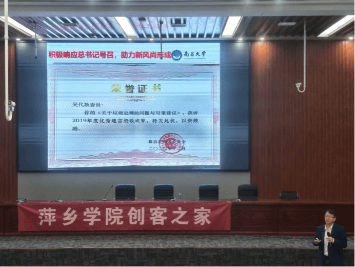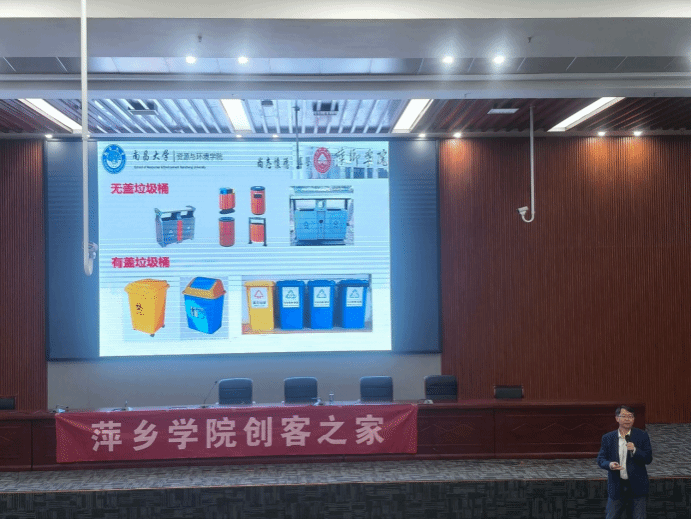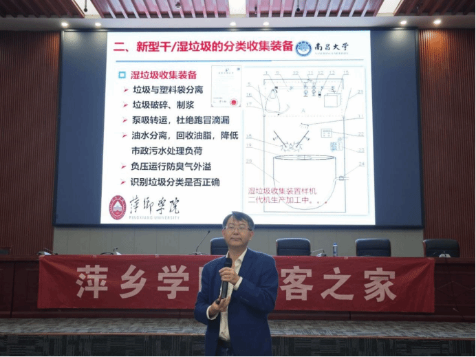讲座伊始,吴代赦先用校园、食堂、饭店等地方的垃圾状况作为例子引进主题,然后以此为中心讲述了习近平总书记强调的垃圾分类工作的国家政策倡导,表明垃圾分类已成为改善民生、推动绿色发展的重要举措。他响应国家政策倡导,在萌发创新性想法后,将设想付诸于实际行动,历经各个难点成功打造出契合政策要求、满足民生需求的垃圾处理科技产品。
