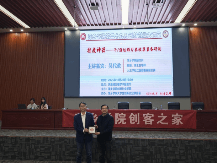 10月23日晚上,我校第二十九期创新创业大讲堂在天泉楼三楼学术报告厅举行,活动特邀萍乡学院副校长、南昌大学博士生导师、全国政协委员吴代赦作为主讲嘉宾,开展主题为《控废神器——干/湿垃圾的分类收集装备研制》。参加活动的有大学生创新创业联合会成员、创客之家成员以及各二级学院学生360余人,活动由创新创业学院院长宋杰光主持。
