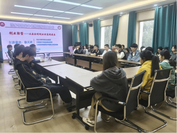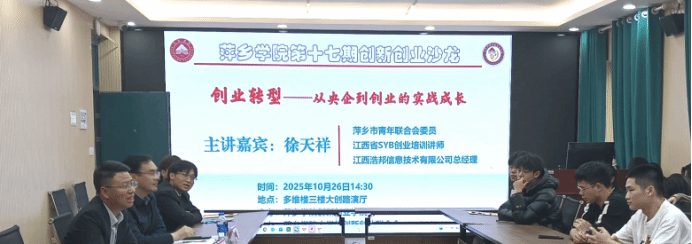 10月26日下午,我校第十七期创新创业沙龙于萍乡学院大学生创新创业孵化基地(多维楼)三楼双创路演教室举办,主题为《创业转型—从央企到创业的实践成长》,活动邀请江西浩邦信息技术有限公司总经理徐天祥担任主讲嘉宾,大学生创新创业孵化基地入孵项目团队代表30余人参与活动,活动由创新创业学院院长宋光杰主持。