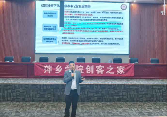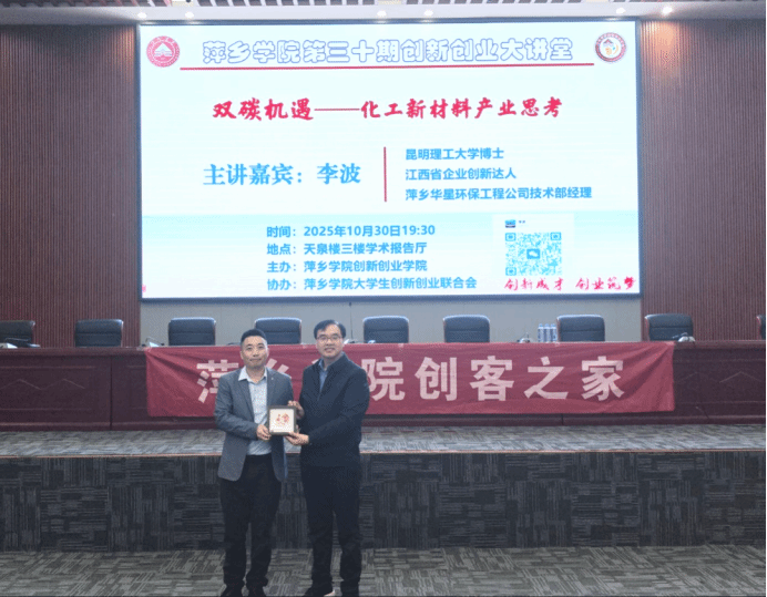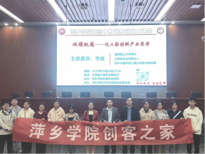 10月30日晚上,我校第三十期创新创业大讲堂在天泉楼三楼学术报告厅举行,活动主讲嘉宾邀请到昆明理工大学博士、萍乡市华星环保工程技术有限公司技术研发部经理李波,开展主题为《双碳机遇——化工新材料产业思考》。参加活动的有材料与化学工程学院博士杨丽、教研科科长吴艳、创新创业联合会成员、创客之家成员以及各二级学院学生360余人,活动由创新创业学院院长宋杰光主持。