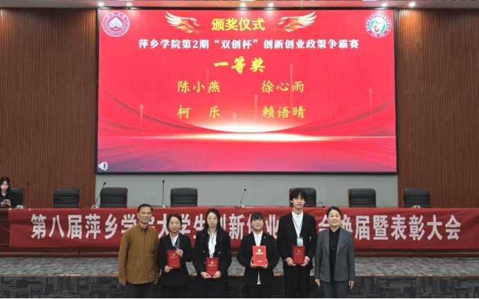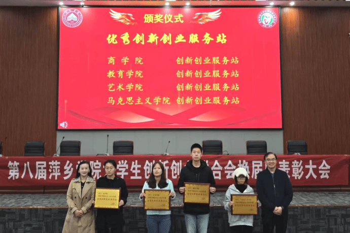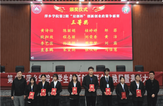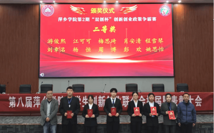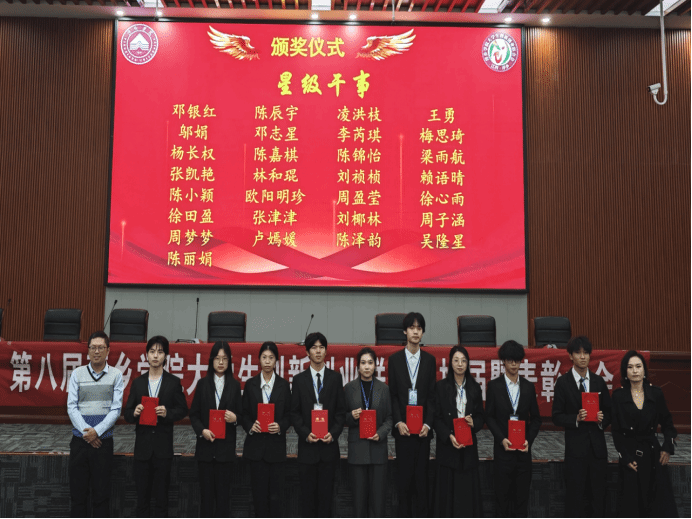 随后,吴艳、刘仁柱为第七届大学生创新创业联合会代表颁发聘书;马静、陈超鋆和陈丹、彭军分别为“星级干事”和“优秀干部”代表颁发荣誉证书;何宇、杨光远和贺艳华、王强分别为“优秀骨干”和“优秀创新创业班级委员”代表颁奖;贺芝、宋杰光为“优秀创新创业服务站”颁发牌匾。此外,刘杰、文凌为第二期创新创业政策争霸赛颁发三等奖,易海峰、陈广民为二等奖获奖者颁发证书,吴强、华强为一等奖获奖者颁发证书。