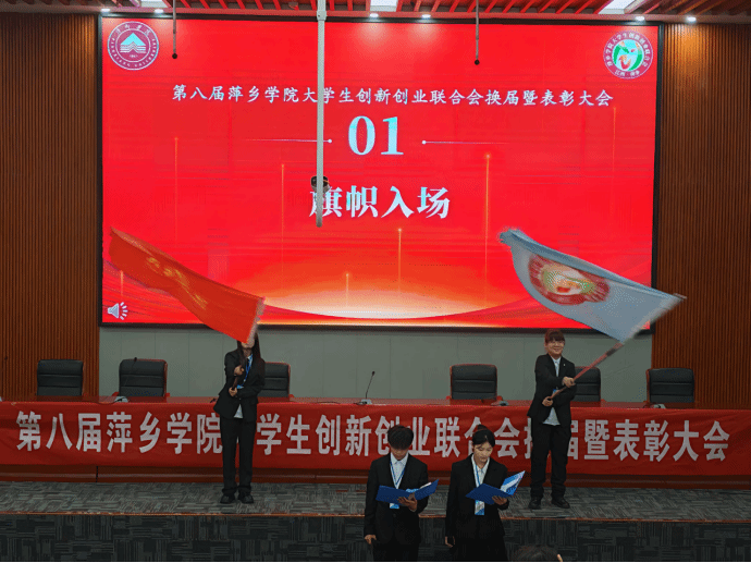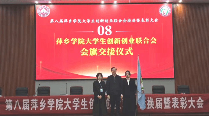 此后,由郑佳宣读第八届萍乡学院大学生创新创业联合会理事会竞聘结果以及新一届理事会成员名单。随之,大会进入会旗交接环节,郑佳郑重地交回会旗给宋杰光,宋杰光将会旗交至新任主席张琦手中并合影留念。紧接着,新一届创联主席张琦作表态性发言,提出了未来工作的初步规划,包括优化内部机制、整合资源展示组织形象、加强内外部联动与合作等,并表示在大家的共同努力下,创联将书写精彩故事,为学校的创新创业教育事业贡献一份坚实而闪耀的青春力量。