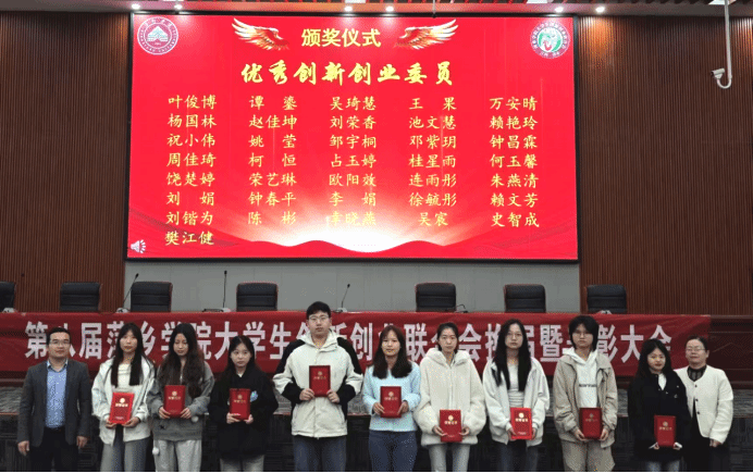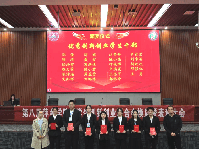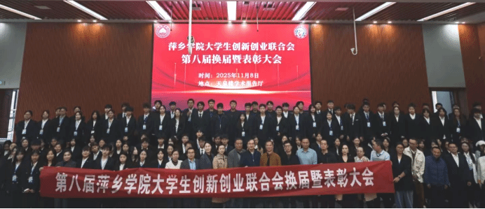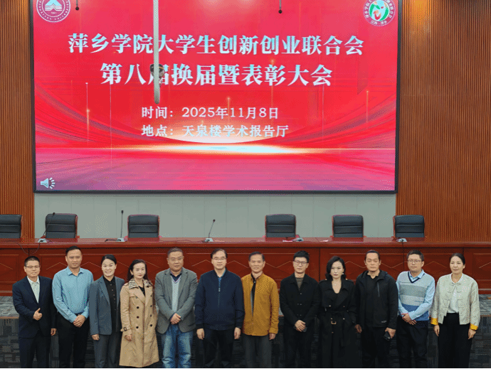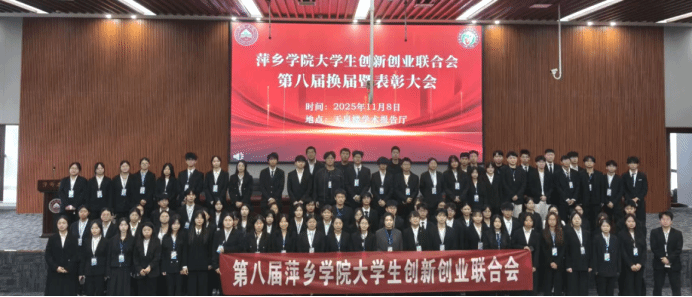 2025年11月8日上午,萍乡学院第八届大学生创新创业联合会换届大会暨表彰大会于天泉楼三楼会议报告厅隆重举行。出席本次会议的有萍乡学院副校长吴代赦、创新创业学院院长宋杰光、财务处副处长陈丹、教务处副处长王强、团委副书记何宇、学生工作处副处长易海峰、创新创业学院实践科科长刘杰、创新创业学院教研科科长吴艳、大学生创新创业联合会指导老师刘仁柱;萍乡市品牌促进会秘书长华强、武功山民宿协会会长文凌、萍乡市信源电瓷制造有限公司总经理陈广民、江西吉内得实业有限公司总经理彭军、江西丰民童乐母婴用品有限公司董事长贺芝、江西百新电瓷电气有限公司副总经理杨光远、江西九靓贸易有限公司董事长马静、萍乡市程品科技有限公司副总经理贺艳华、上栗金圆花炮制造有限公司销售总监吴强、江西省就业创业服务中心指导专家陈超鋆;以及来自江西工业工程职业技术学院、江西应用工程职业技术学院、萍乡卫生职业学院、萍乡市技师学院的校级组织代表、我校各校级学生组织及协会负责人、广播站等四大媒体负责人、各二级学院创新创业服务站代表、优秀创业委员代表、创联全体成员等共计200余人。大会全面总结了过去学年工作,并对过去一年中涌现的先进个人与团体予以表彰,激励创联全体成员继往开来,再创辉煌。