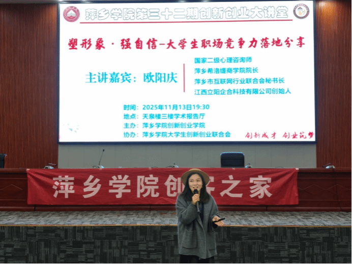 11月13日晚上,我校第32期创新创业大讲堂在天泉楼三楼学术报告厅举行,活动特邀国家二级心理咨询师,江西立阳企合科技有限公司创始人欧阳庆作为主讲嘉宾,开展主题为《塑形象· 强自信--大学生职业竞争力落地分享》。参加活动的有萍乡希洛缇商学院团队代表、创新创业导师代表、创新创业联合会成员代表、创客之家成员代表以及各二级学院学生代表约360人参加,活动由创新创业学院院长宋杰光主持。