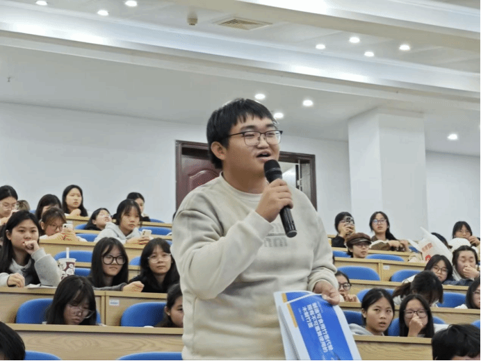 在互动环节,在场同学积极上台,与欧阳庆交流衣着的搭配方法与技巧。同学们纷纷提出自己在日常穿搭中遇到的困惑,比如不同场合如何选择合适的服装颜色、款式,怎样根据自身身材特点进行搭配等。欧阳庆耐心细致地一一解答,不仅从理论层面给予专业建议,还现场挑选了几位同学进行搭配示范,让大家更直观地感受到合理搭配带来的形象提升效果,现场气氛十分热烈。