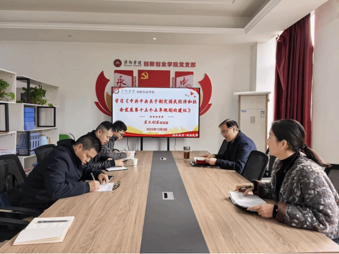 12月3日,创新创业学院星火创客党支部组织开展学习《中共中央关于制定国民经济和社会发展第十五个五年规划的建议》(以下简称“‘十五五’规划建议”)专题活动。党支部全体党员参加学习,创新创业学院党支部书记宋杰光领学,推动理论学习与双创实践深度融合。