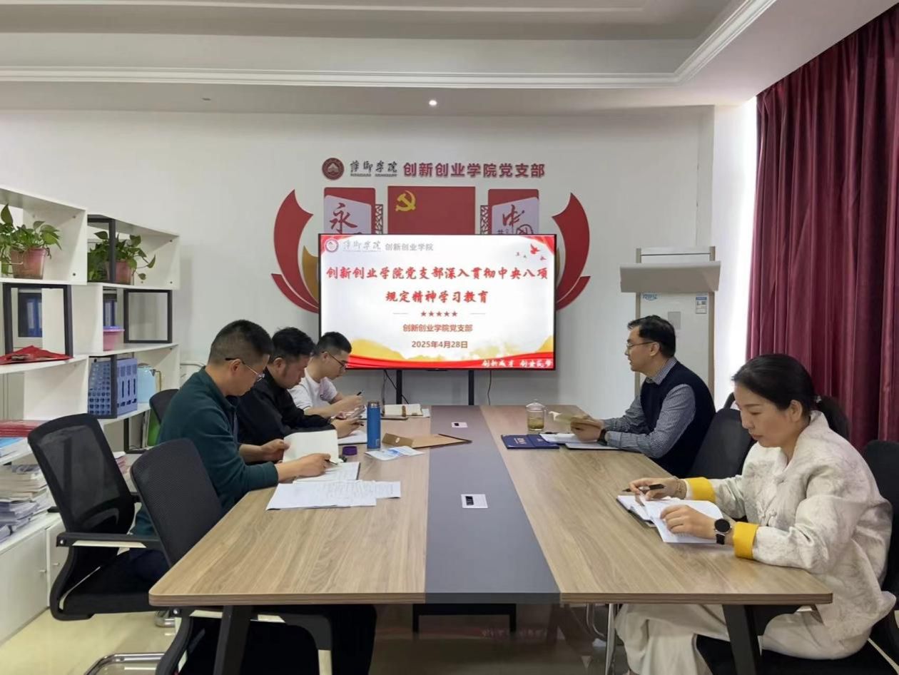 4月28日,创新创业学院党支部召开党员大会,组织全体党员开展深入贯彻中央八项规定精神学习教育,学习《习近平关于加强党的作风建设论述摘编》内容。会议由党支部书记宋杰光主持。