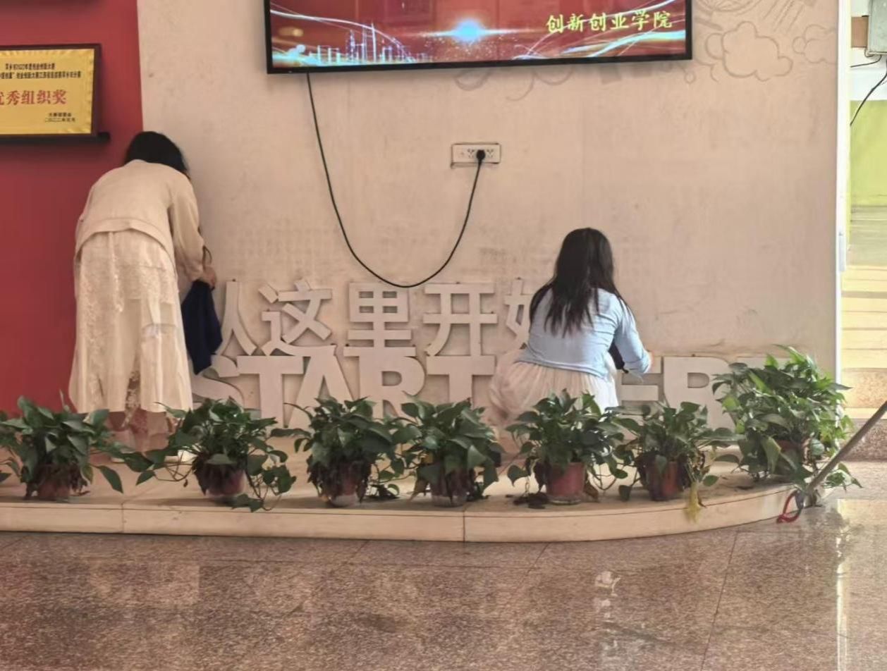 活动开始后,大家分两路行动:双创服务组和双创环境组。双创服务队深入入驻孵化基地的团队工作室,仔细检查安全情况,同时与项目组成员交流,了解双创政策利用情况,了解项目进展现状,工作室条件优化,后续孵化发展等方面进行深入交流和提出建议,鼓励他们利用好学校提供的系列双创政策,锻炼自己的实践能力,为以后的就业创业打下基础。