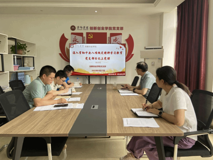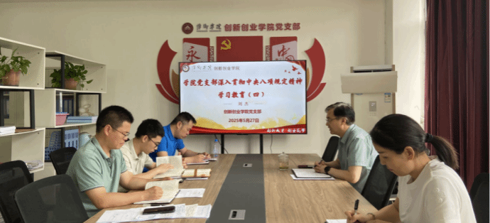 5月27日,创新创业学院党支部组织全体党员开展主题为《学习贯彻中央八项规定精神学习教育》专题党课学习,此次学习活动由党支部书记宋杰光主持。