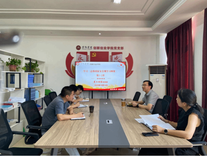 为深入贯彻落实总体国家安全观,切实提升支部党员的国家安全意识与责任担当,10月10日,创新创业学院星火创客党支部组织全体党员开展《总体国家安全观学习纲要》集中学习活动。活动由党支部书记宋杰光主持,全部教师参加,通过 “领学+研讨”的形式,推动《纲要》内容入脑入心,为创新创业工作筑牢安全思想根基。