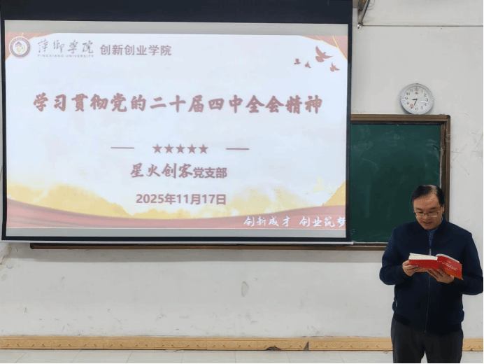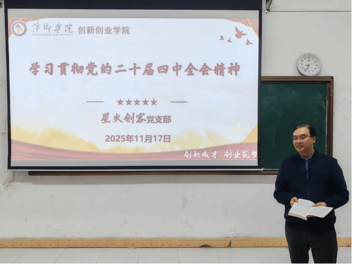 11月17日,创新创业学院党支部书记宋杰光带领大学生创新创业联合会会员代表和无机非金属材料工程2024级2班同学代表约100人,开展党的二十届四中全会精神专题学习活动,旨在引导青年学子深刻领会全会精神内涵,将思想和行动统一到党中央决策部署上来,为创新创业实践注入精神动力。活动通过原文研读、要点解读、交流研讨等形式展开,确保学习入脑入心。