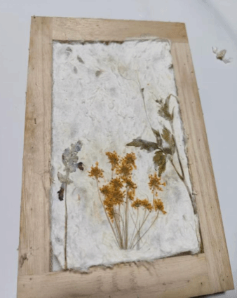 古法造纸实践环节将活动推向高潮,项目成员细致讲解“选材、切片、洗涤、蒸煮、舂捣、打浆、抄纸、晒纸”八大古法工序,并特别设计“木旋辅助小技巧”——用迷你木旋工具辅助搅拌纸浆、平整纸膜,让木旋玩具元素贯穿制作全程。亲子家庭携手合作,从捣碎原料到抄纸成型,再用干花装饰纸页,亲手完成独一无二的手工纸。
