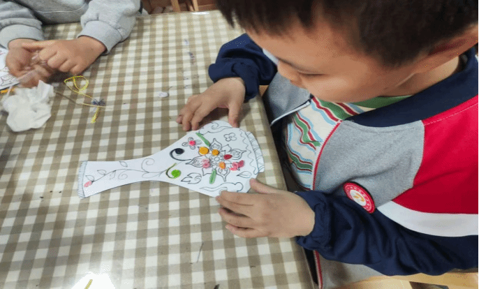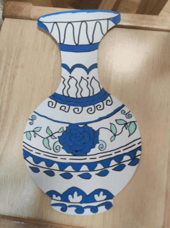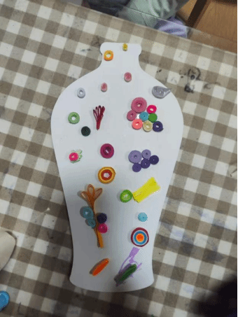 最受孩子们期待的花瓶彩绘环节,将活动推向了高潮。空白的花瓶绘画卡纸摆在桌前,孩子们拿着画笔和衍纸条,将刚刚学会的卷草纹、回纹、云纹,一笔一画绘在瓶身上。有的孩子以瓶身为轴,画了一圈连绵的卷草纹,像给花瓶穿上了一件带着春日气息的新衣;还有的孩子用衍纸条制作水滴、花瓣等造型,搭配传统纹样贴在瓶身上,创作出了“云绕草间”“花开瓶上”的童趣画面。每一件花瓶作品,都是孩子与非遗文化的对话。
