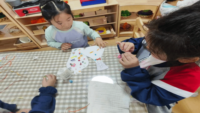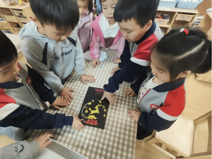木质拼图环节,孩子们迎来了自己的“纹样创作挑战”。老师将印有简化版卷草纹、回纹的木质拼图材料分发到每个孩子手中,引导他们观察纹样的对称与连续特点,一步步完成拼接。当一片片木片拼合,完整的卷草纹图案在手中呈现时,孩子们眼里闪着光,亲手触摸着自己拼出的纹样,也读懂了“对称与连续”的传统美学逻辑。