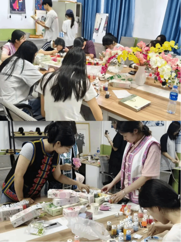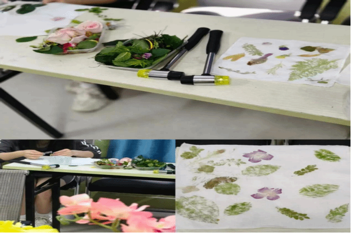 活动当天,工作室花香、染香与书香交织,氛围感拉满。本次活动设置了多个趣味环节,让参与者全方位体验传统手工艺的乐趣。在扎染方巾体验区,大家从折叠、捆扎、夹染到调色、浸染、固色,一步步认真学习、大胆创作。零基础的师生也能制作出独一无二的蓝白方巾,晕染如画的纹理,将春日诗意永久留在布上。草木拓染环节中,新鲜花叶搭配拓染锤轻轻一敲,无化学染料的纯天然印记在方巾上浮现,每一片叶子、每一朵小花都留下了春天独有的模样,清新又治愈。