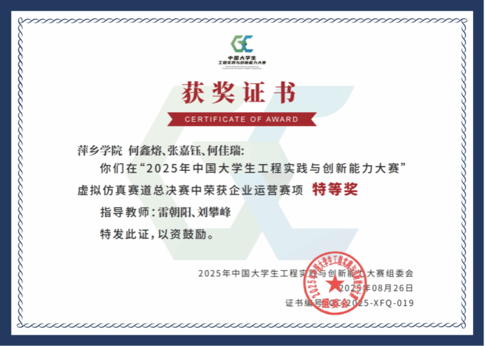 2025年8月7日至9日,以“交叉融合工程创新育新质,立德树人强国建设勇担当”为主题的中国大学生工创赛企业仿真运营赛全国总决赛在大连工业大学隆重举行。本次赛事汇聚了全国205支顶尖队伍,我院何鑫熔、张嘉钰、何佳瑞三位同学在雷朝阳、刘攀峰老师的带领下勇毅前行、敢于亮剑,与西安交通大学、四川大学、哈尔滨工业大学、吉林大学等知名高校同台竞技,凭借卓越的综合实力斩获全国特等奖,这是我院连续三次获此殊荣。