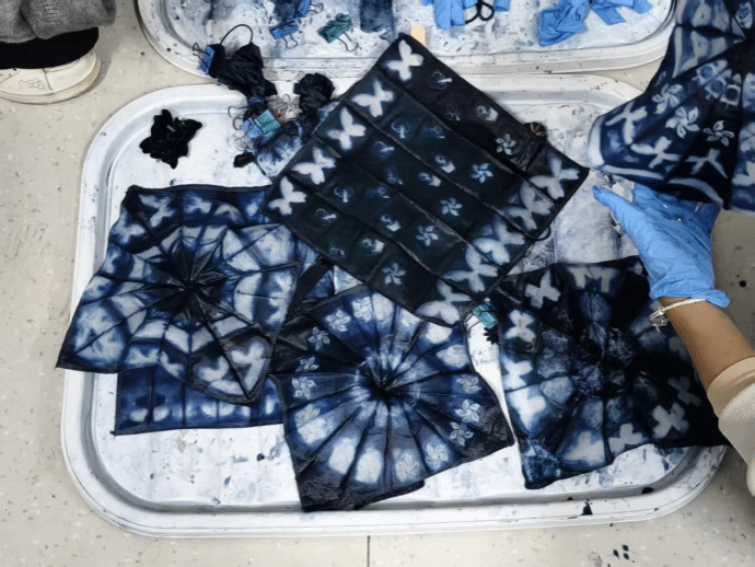 现场素布翻飞,靛蓝流淌,参与者以皮筋、木夹为工具,创作出纹样各异的方巾与花束。体验活动将传统扎染元素、傩元素与现代审美结合,通过沉浸式扎染体验与趣味互动,赋予其新时代的活力,让校园师生直观感受非遗工艺的独特魅力,激发师生的动手能力与创新思维,不仅复现了传统工艺,更将现代创意融入等新载体,让古老技艺及文化焕发青春活力。