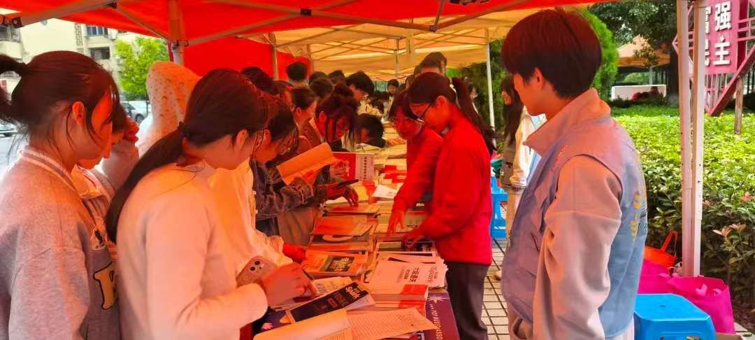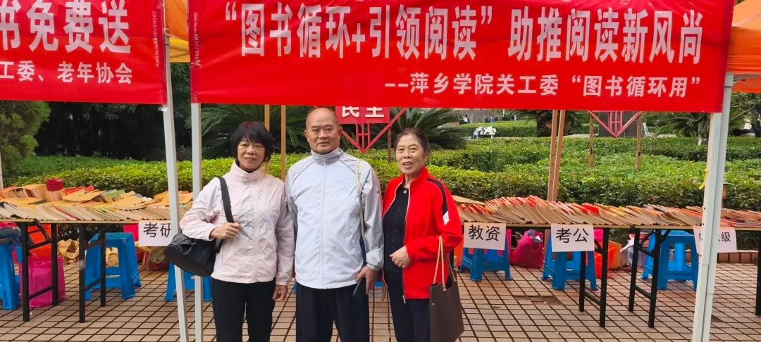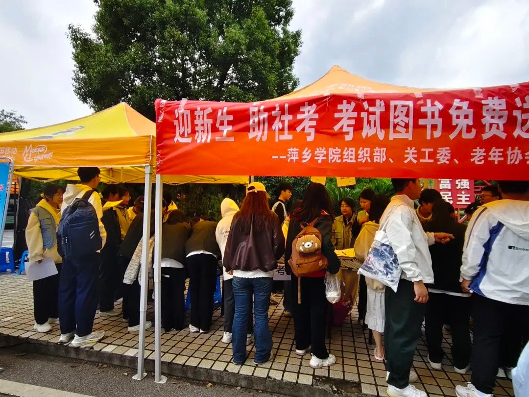 10月22日,大创项目《图书循环用》团队在文廷式广场,开展以“书香传情,梦想启航”为主题的“迎新生、助社考”考试图书免费送活动,参加活动的有萍乡学院党委组织部副部长、机关党委副书记胡艳维,党委组织部副部长黄如光,党委组织部副部长朱艳清,党委组织部干部人才科副科长欧阳甜甜,萍乡学院老年协会主席潘运华,萍乡政协杂志编辑部主任杨海涛莅临指导,与同学们亲切交流,并鼓励大家善用资源、勤学奋进。此次活动还赠送考研、考编、专业资格等各类社会考试图书五百多册。