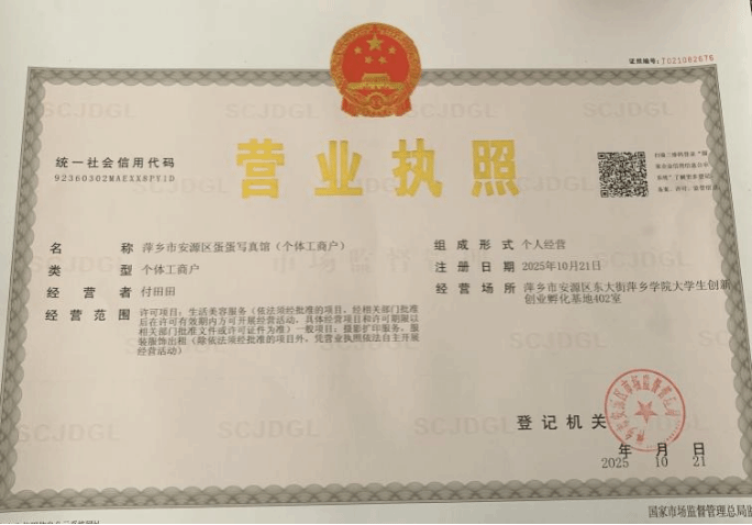 并且在自媒体平台运营成果显著摄影内容传播度高,单条作品最高获赞3万+,具备良好的内容创作与新媒体传播能力。在持续深耕摄影领域、积累充足实践经验与行业资源后,将创业想法落地为实际项目,于2025年9月成功创办蛋蛋自拍馆,并全面担任场馆负责人。作为自拍馆创始人与负责人,统筹负责场馆的整体运营管理、项目规划、客户服务、团队协调等各项工作,从装修设计,到拍摄场景搭建、服务流程完善,再到市场推广、品牌打造,全程亲力亲为,将在校期间积累的摄影技术、自媒体运营经验与创新创业实践能力充分运用到实际经营中,打造出特色鲜明的自拍馆品牌,不仅实现了个人创业梦想,也以实际行动践行了当代大学生勇于创新、敢于创业的精神风貌。