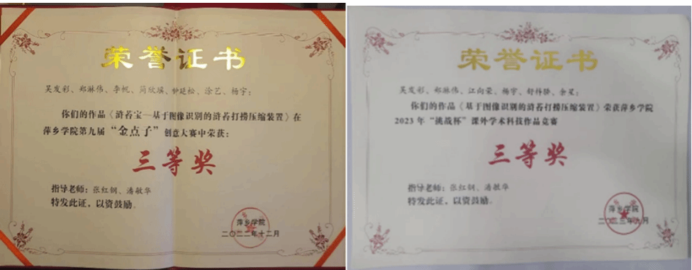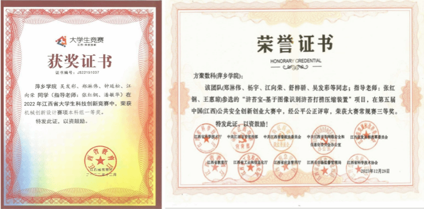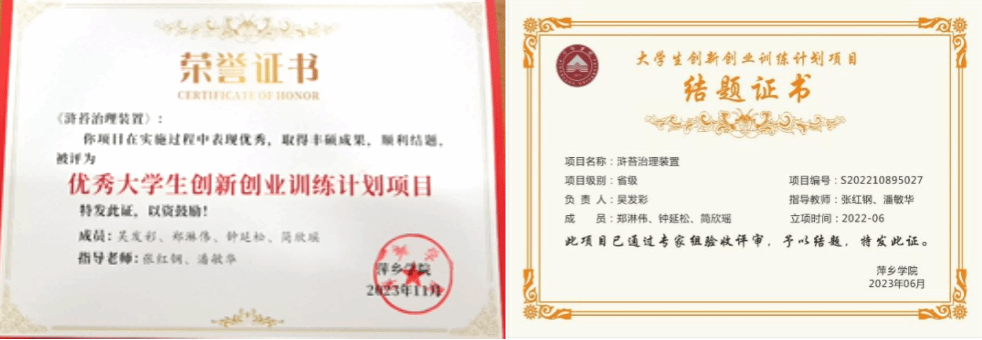 本科期间,负责浒苔宝-浒苔治理装置于2022年获批江西省大学生创新创业训练计划项目立项,并于2023年顺利结题,于2023年3月完成相关实物设备的设计加工与测试,项目被评选为萍乡学院《优秀大学生创新创业训练项目》,并获评2023年度萍乡学院创新创业“江南”奖学金。