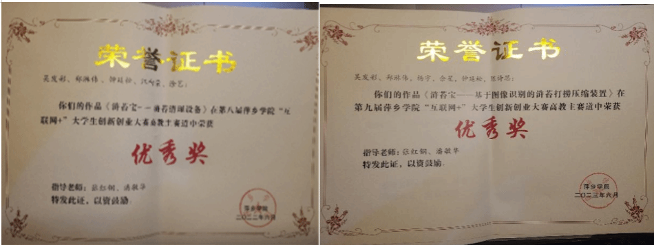 项目在校内竞赛方面多次参加萍乡学院创新创业学院举办创新创业竞赛。曾获得萍乡学院第九届“金点子”获得三等奖;萍乡学院2023年“挑战杯”课外学术科技作品竞赛获得三等奖;第八届“互联网+”大学生创新创业大赛获得优胜奖;第九届“互联网+”大学生创新创业大赛获得优胜奖;萍乡学院第九届创意大赛中获得优秀奖等。