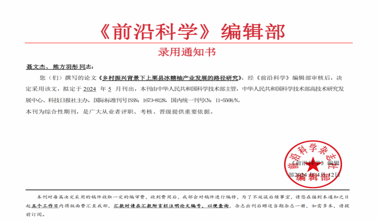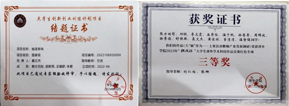 大创项目柚滋有味研究期间,熊方羽彤作为核心成员,积极参加挑战杯学术科技作品竞赛,期间攥写的论文《乡村背景下上栗县冰糖柚产业发展的路径研究》于《前沿科学》录用,为现代农业发展贡献了自己的智慧和力量。
