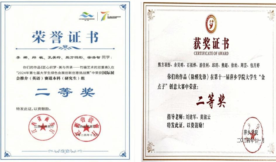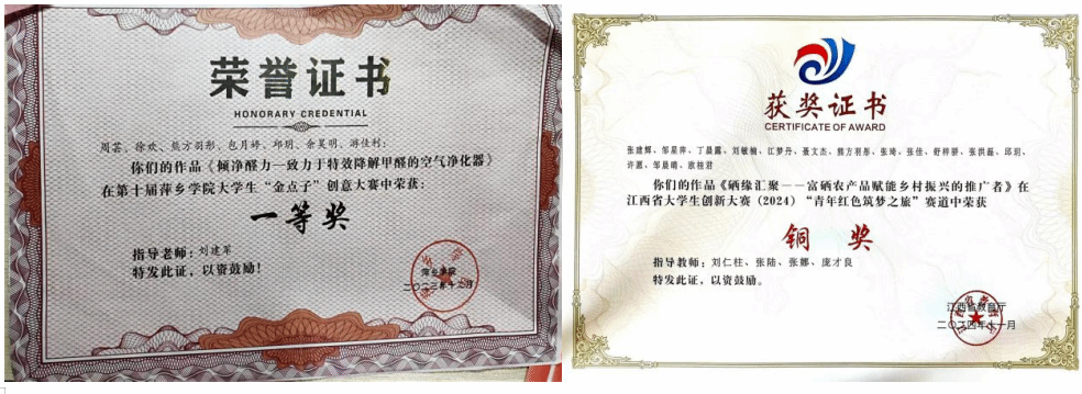 自团队成立以来,她始终秉持着积极进取的精神,投身于各类创新创业大赛的浪潮之中,勇于探索未知,不断突破。先后荣获萍乡学院大学生金点子创意大赛一等奖,江西省大学生创新大赛青年红色筑梦之旅铜奖,全国大学生绿色会展创新创意挑战赛国际会展讲解赛道二等奖,萍乡学院大学生金点子创意大赛二等奖,萍乡学院大学生创新大赛金奖等诸多奖项。