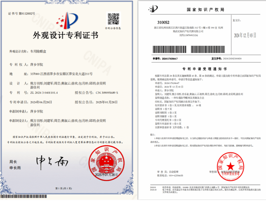 主持大创项目小清新期间,熊方羽彤和团队成员不仅深入学习了甲醛的理化性质和检测方法,并且勇于担当创新使命,已成功申请了2项专利,其中1项专利已经授权,彰显了团队的科技实力与创新精神。